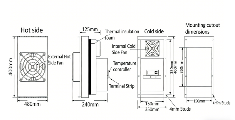 SANDA's 150 W DC solid state TEC air conditioner models are designed to cool your electronic and electrical controls, instruments, computer terminals, printers, telecommunications equipment, surveillance devices, cameras, laser and optical equipment and many other electronics in variety of environments.